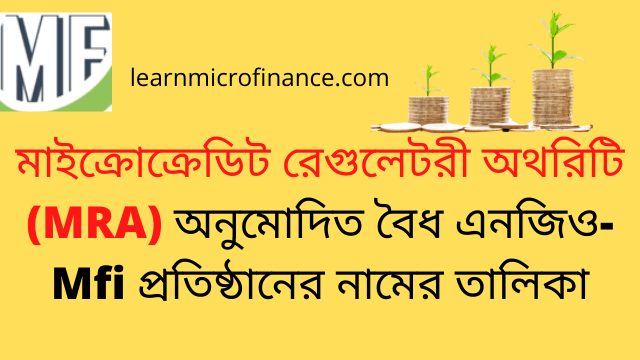 নোট : মাইক্রোক্রেডিট রেগুলেটরী অথরিটি কর্তৃক অনুমোদিত না হলে বাংলাদেশে কোনও এনজিও MFi বৈধ ভাবে মাইক্রোক্রেডিট এর কাজ করতে পারে না। বৈধ প্রতিষ্ঠান হতে হলে অবশ্যই MRA সনদ থাকেতে হবে। Microcredit Regulatory Authority – MRA, হটলাইন নম্বর- ১৬১৩৩